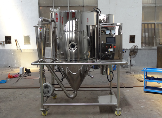空氣經過濾和加熱,進入干燥器頂部空氣分配器,熱空氣呈螺旋狀均勻地進入干燥室。料液經塔體頂部的高速離心霧化器,(旋轉)噴霧成極細微的霧狀液珠,與熱空氣并流接觸在極短的時間內可干燥為成品。成品連續地由干燥塔底部和旋風分離器中輸出,廢氣由風機排空。